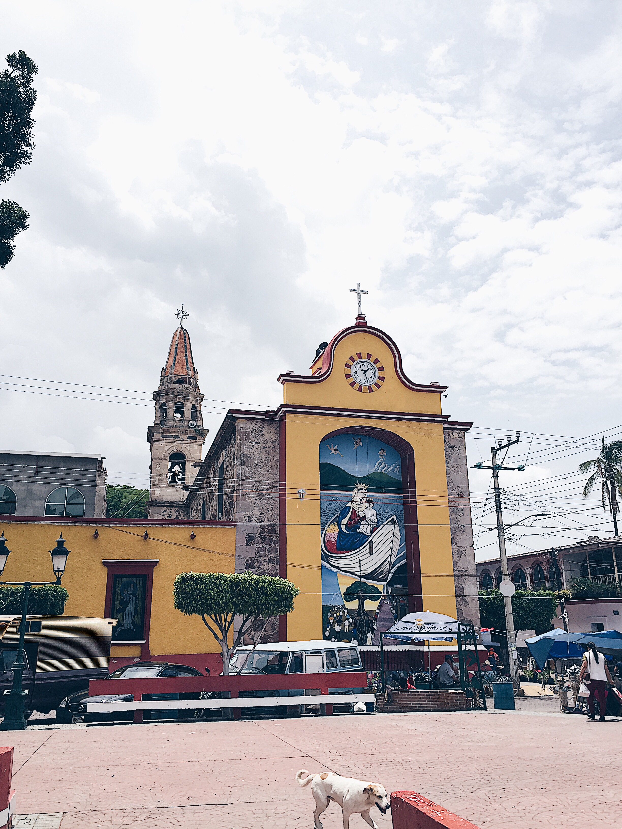 *a painting of Mary holding Jesus, on the side of the church*