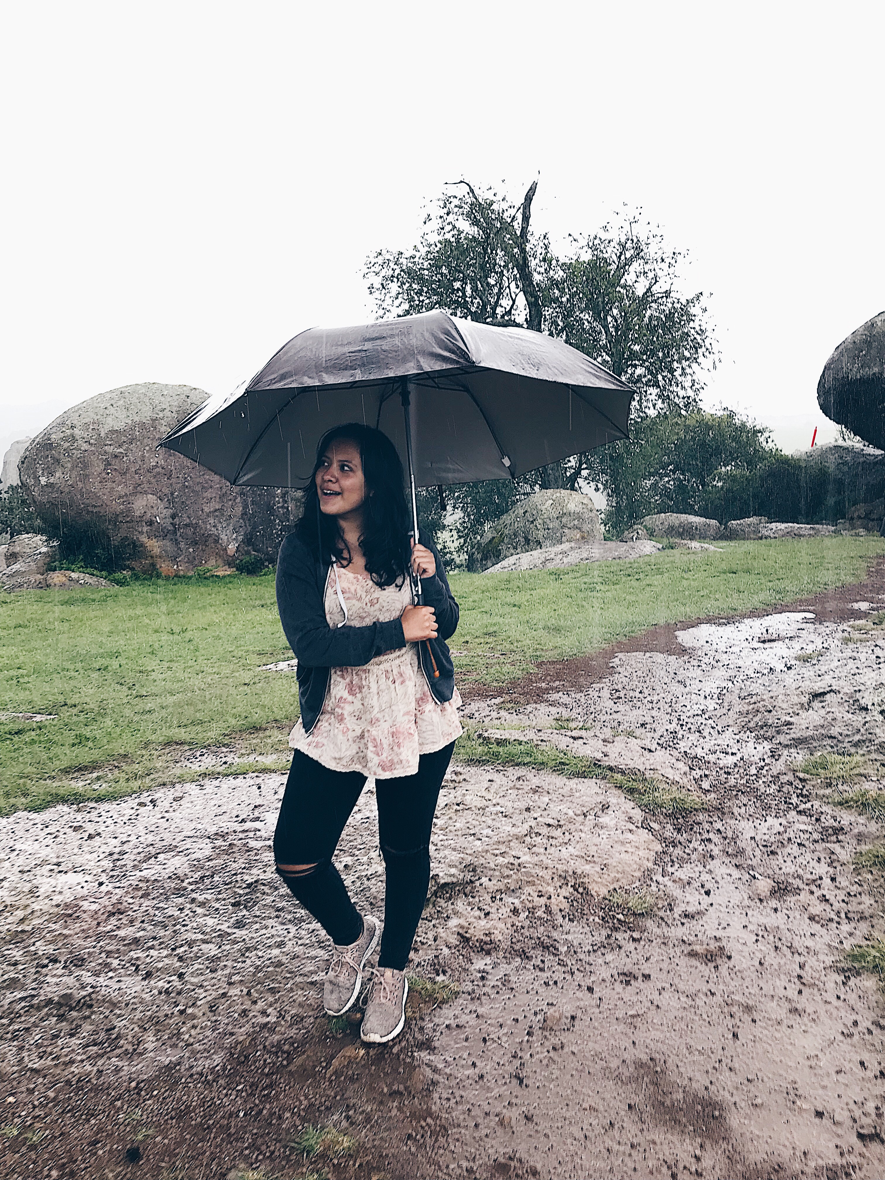 Later my cousin, sister and I went on a little trail to see Las Piedrotas. Las piedrotas translates to “The huge rocks”. It started to rain a lot and people started to leave. We’re crazy though and marched up there with an umbrella anyway.